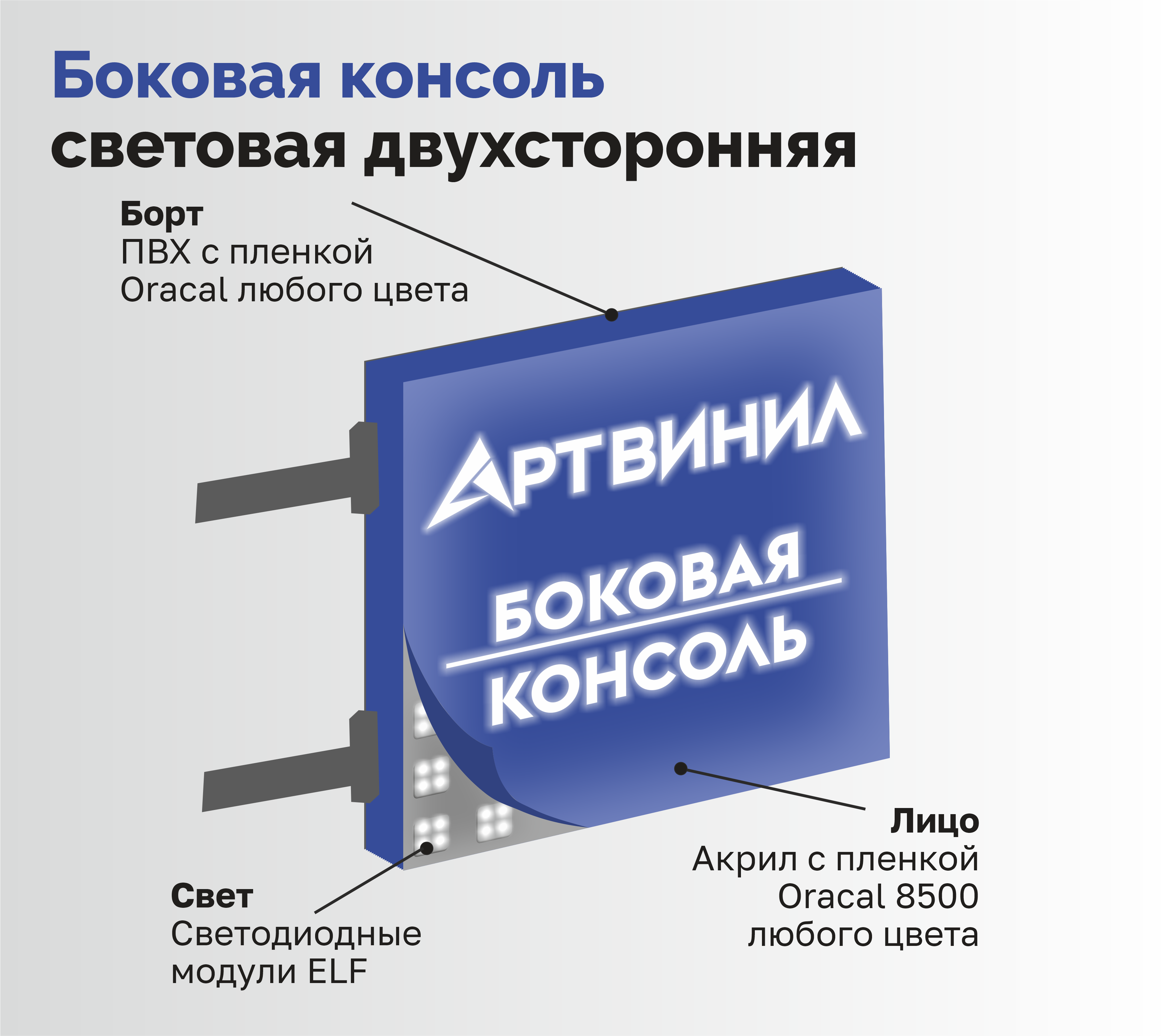 - Двусторонние – крепится на углах зданий, такими коробами можно оформлять углы зданий, информация нанесена на двух сторонах.