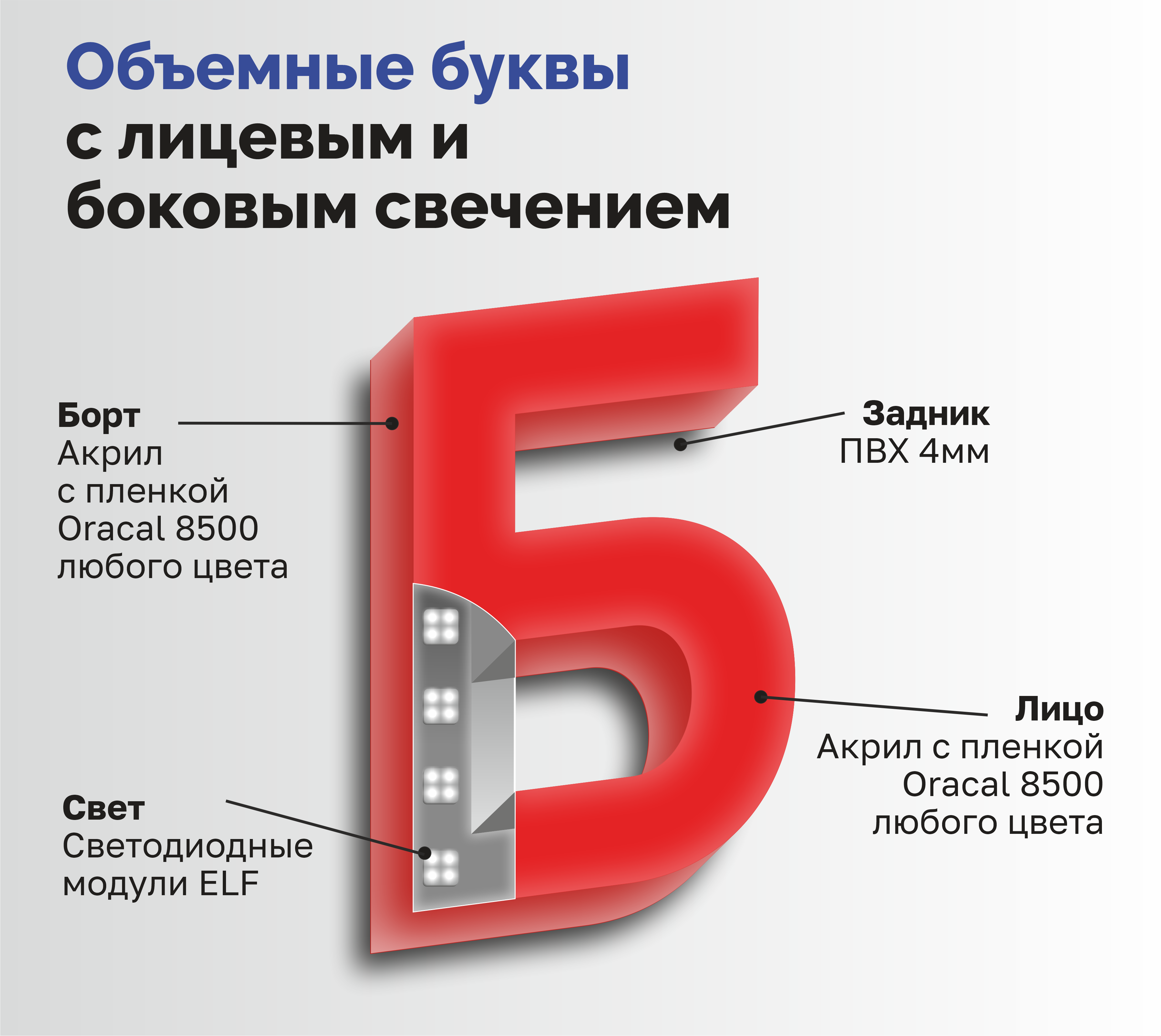 Объемные буквы с лицевым и боковым свечением — это современный и стильный способ оформления рекламных и информационных вывесок. Они представляют собой объемные буквы, которые освещаются изнутри специальными светодиодными лампами, что позволяет создать яркий и привлекательный эффект.