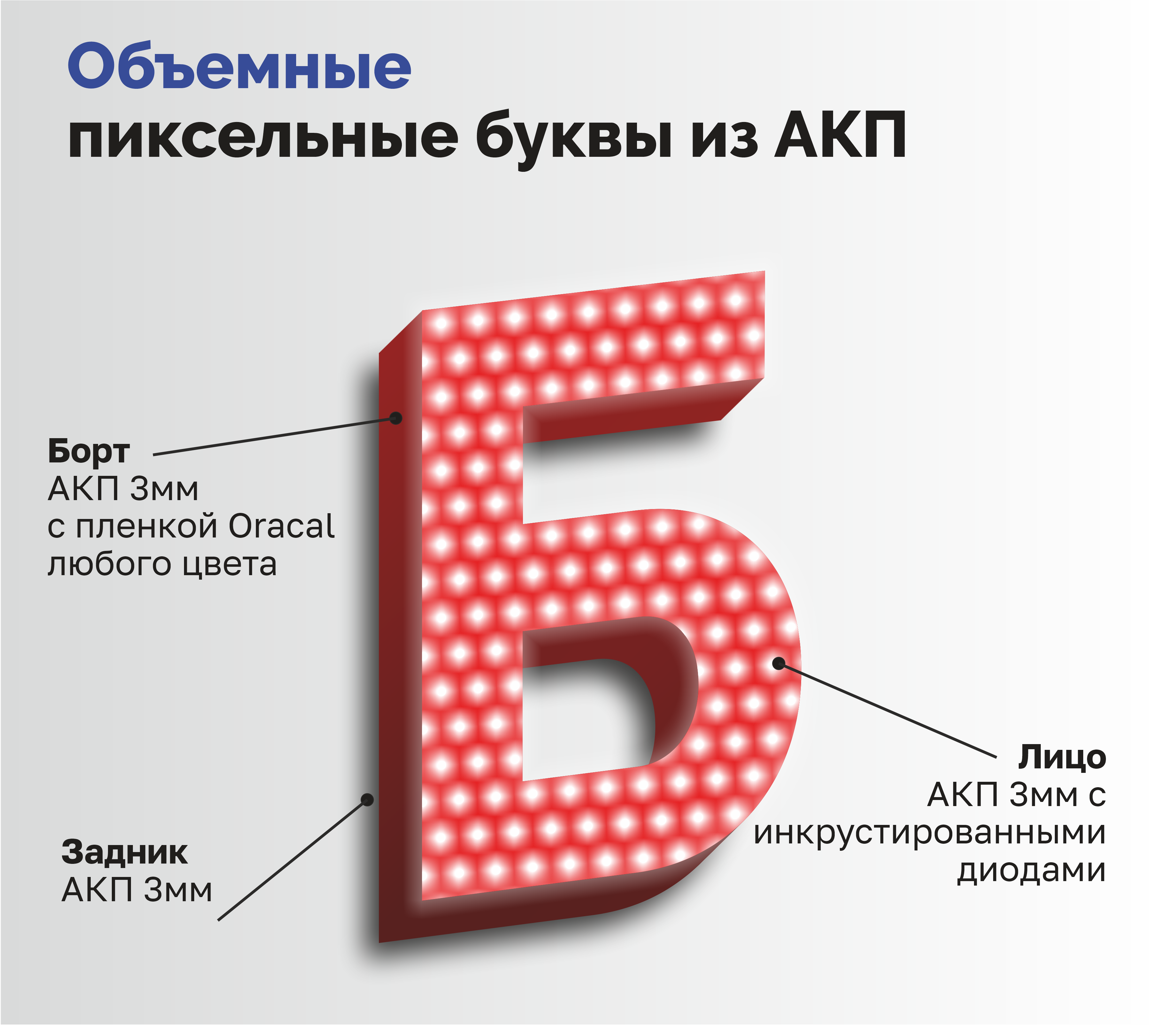Объемные пиксельные буквы из АКП могут быть выполнены из различных материалов, таких как пластик, композит и т.д. Они имеют различные формы и размеры, что позволяет подобрать оптимальный вариант для каждого конкретного случая.