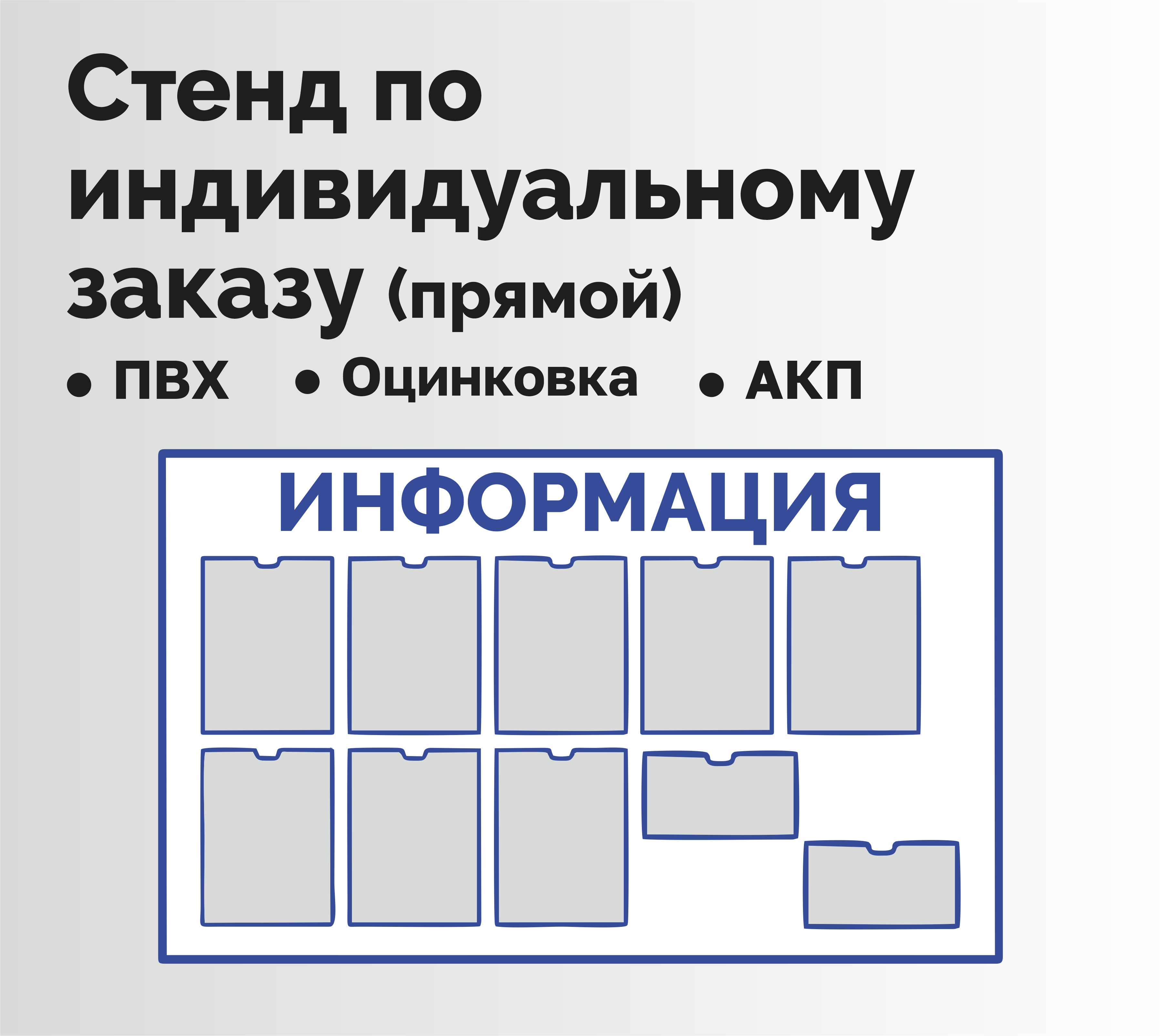 ОБЯЗАТЕЛЬНО! При оформлении заказа, в комментариях указать цвет и оформление стенда (цвет фона, текста, заголовка, либо полноцветная печать), количество, размеры и виды карманов (если есть).